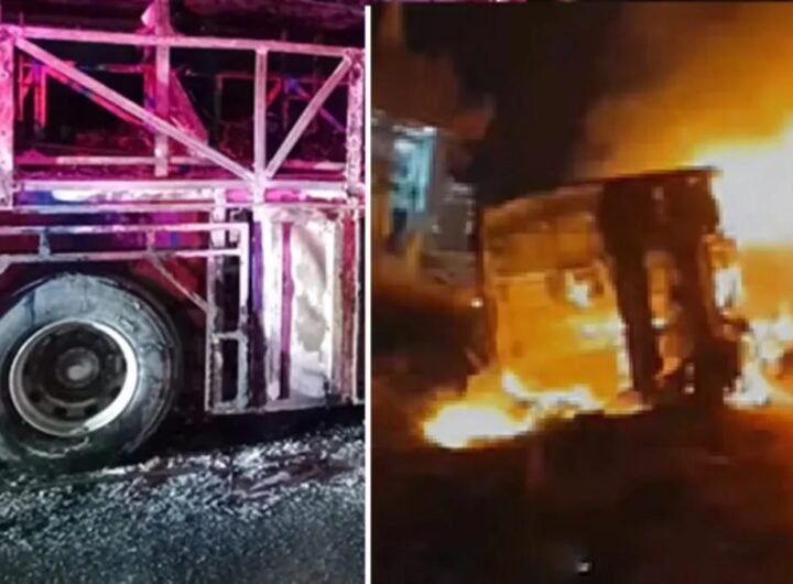 बाइक से टकराने के बाद बस में भड़की भीषण आग, 39 में से कई यात्री बुरी तरह...