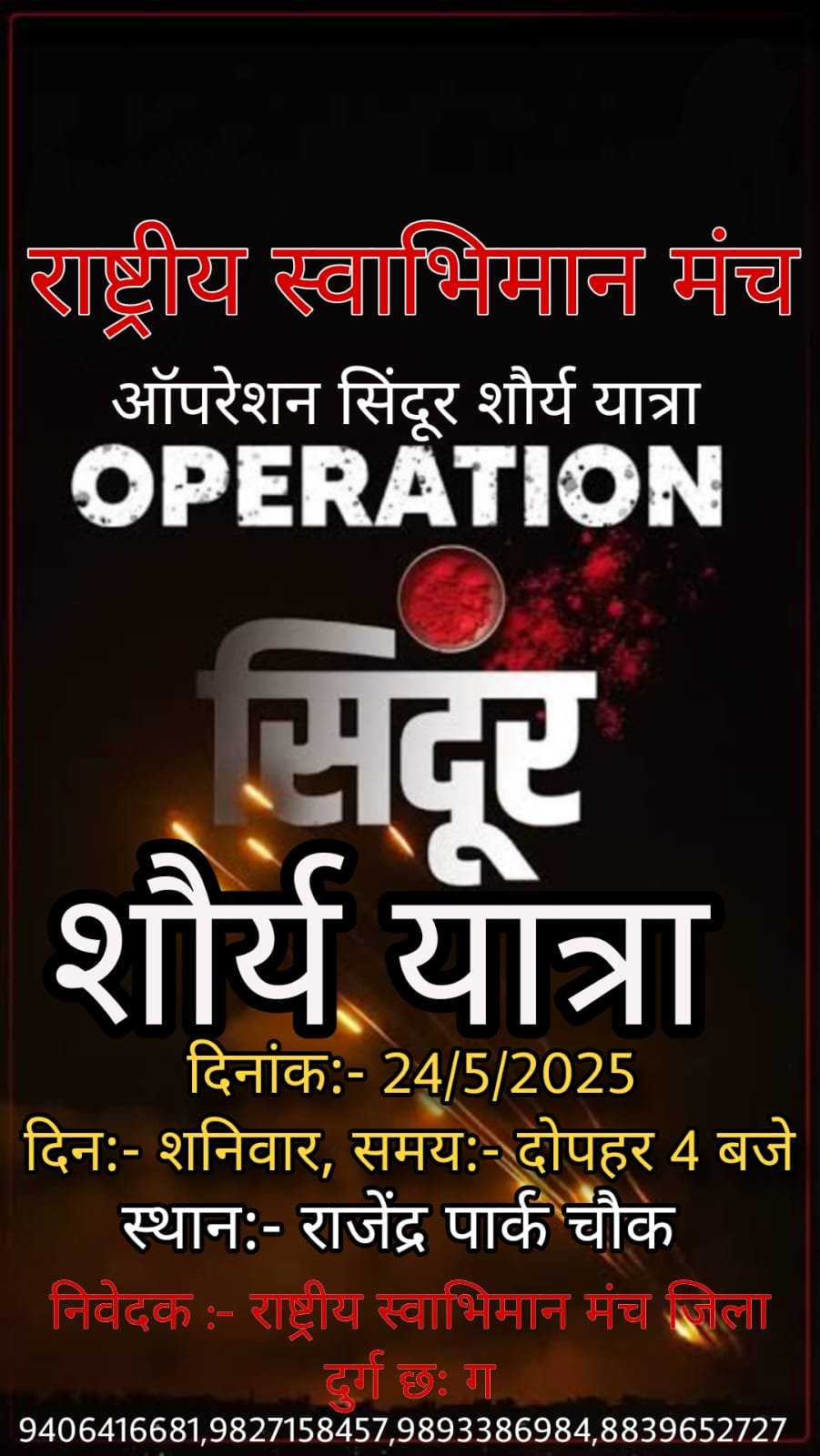 दुर्ग के राजेंद्र पार्क में 24 मई 2025 को एक विशेष आयोजन ‘सिंदूर शौर्य यात्रा एवं सभा’ का आयोजन किया जा रहा है, जिसका उद्देश्य हाल ही में पहलगाम आतंकी हमले में शहीद हुए रायपुर निवासी को श्रद्धांजलि अर्पित करना है। यह कार्यक्रम मातृशक्ति को समर्पित रहेगा और राष्ट्रभक्ति से ओतप्रोत एकता का संदेश देगा।
