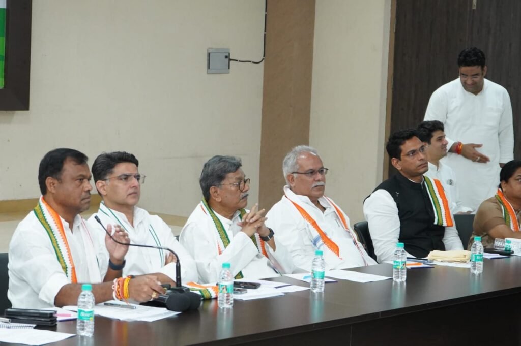 रायपुर। छत्तीसगढ़ कांग्रेस की रणनीतिक तैयारियों को लेकर राजधानी रायपुर में रविवार को कांग्रेस की पॉलिटिकल अफेयर कमेटी की एक अहम बैठक का आयोजन किया गया। इस बैठक की अध्यक्षता वरिष्ठ नेता एवं पूर्व उपमुख्यमंत्री सचिन पायलट ने की। बैठक में पूर्व मुख्यमंत्री भूपेश बघेल, विधायक देवेंद्र यादव, प्रदेश अध्यक्ष सहित कई वरिष्ठ नेता शामिल हुए।