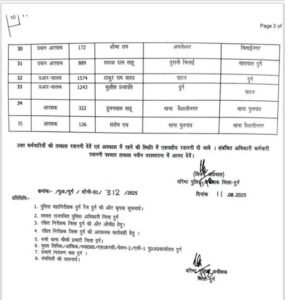 दुर्ग। जिले में पुलिस प्रशासनिक ढांचे को मजबूत करने और कार्यकुशलता बढ़ाने के लिए पुलिस अधीक्षक विजय अग्रवाल ने मंगलवार को 33 पुलिसकर्मियों के तबादले के आदेश जारी किए। इस सूची में 2 सब-इंस्पेक्टर, 5 असिस्टेंट सब-इंस्पेक्टर, 24 हेड कांस्टेबल और 2 कांस्टेबल शामिल हैं।
