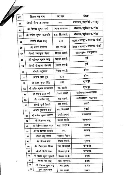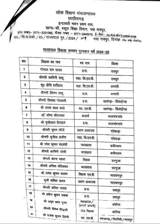 इधर, प्रदेश स्तर पर भी 64 शिक्षकों का चयन उत्कृष्ट शिक्षा सम्मान के लिए किया गया है। राज्यपाल रमन डेका 5 सितंबर को सुबह 11 बजे राजभवन में इनका सम्मान करेंगे। इस अवसर पर मुख्यमंत्री विष्णु देव साय कार्यक्रम की अध्यक्षता करेंगे, जबकि स्कूल शिक्षा मंत्री गजेंद्र यादव विशिष्ट अतिथि रहेंगे।
